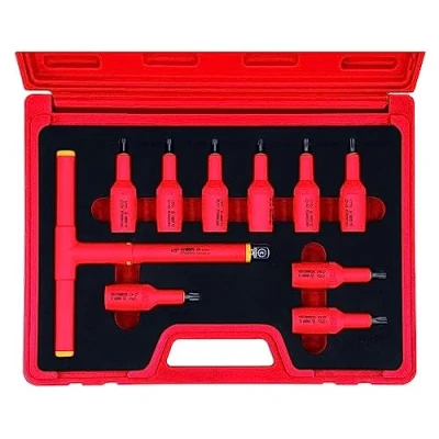 Set contents: 9x 1/2"D Star* bit sockets;1x 1/2"D T-handle. Sizes: T20;T25;T27;T30;T40;T45;T47;T50 & T55 for use on Torx* fixings. Safe operator use for live voltages up to 1000V AC / 1500V DC (manufactured to IEC60900:2018). Manufactured from chrome vanadium. Supplied in a robust blow mould carry case with an EVA foam tray for safe storage. Insulated hex bit set also available;please see Part No. 8561.