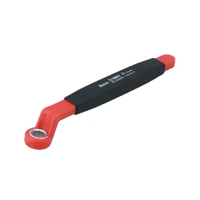 Size: Bi-Hex (12pt) x 8mm; length: 160mm. 75 degree offset head ideal for access in difficult areas. Safe operator use for live voltages up to 1000V AC / 1500V DC. VDE certified. IEC60900:2018 approved for 1000V safe working. Manufactured from chrome vanadium. Other sizes available, see Part Nos. 8562 (7mm), 8564 (10mm), 8565 (12mm) and 8566 (14mm).