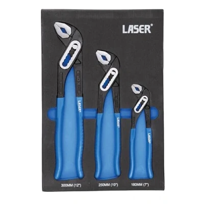 3x water pump pliers with adjustable serrated jaws. Sizes: 180mm (7”), 250mm (10”) & 300mm (12”). Ranges: 0 – 30mm, 0 – 35mm & 0 – 40mm. Manufactured from chrome vanadium, with vinyl dipped handles for grip & comfort. Presented in an EVA foam tray (25 x 234 x 347mm) convenient for user storage & limiting packaging waste.