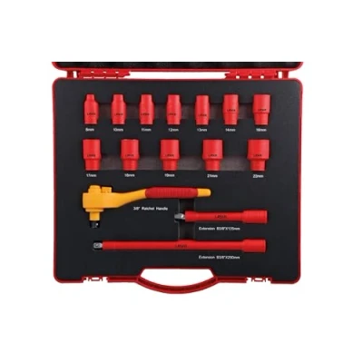 Fully insulated 3/8"D 45 teeth ratchet mechanism. Length: 200mm. 12x 3/8"D single hex (6 pt) sockets. Sizes; 8, 9, 10, 11, 12, 13, 14, 16, 17, 18, 19, 21 & 22mm. 2x extension bars. Lengths: 125 & 250mm. VDE certified. Manufactured to IEC60900 standards, for safe operator use on live voltages up to 1000V AC / 1500V DC. Supplied in a heavy-duty plastic case with routed foam tray to retain tools securely.