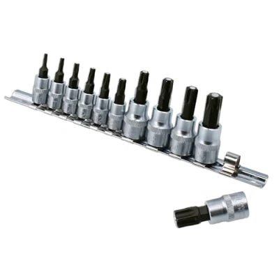 Magnetic Star* bit sockets, suitable for use on TORX* fixings. 1/4"D socket bits: T10, T15, T20, T25, T27, T30. Length: 37mm. 3/8"D socket bits: T40, T45, T50, T55, T60. Length: 48mm. Sockets manufactured from satin finish chrome vanadium (CRV), bits from impact grade S2 steel. Supplied on a socket rail for easy storage. *TORX & TORX PLUS are registered trademarks of Acument Intellectual Properties, LLC.