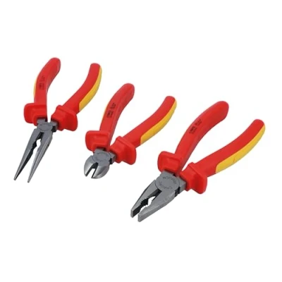 Combination Pliers; Length: 209mm; jaw opening: 37mm. Long Nose Pliers; Length: 220mm; jaw opening: 82mm. Diagonal Side Cutters; Length: 166mm; jaw opening: 18mm. Manufactured to IEC60900 standards, for safe operator use on live voltages up to 1000V AC / 1500V DC. Manufactured from chrome vanadium, with 2 colour thermoplastic rubber (TPR) insulated handles with slip guards. Presented in a EVA foam tray (36 x 198 x 280mm).