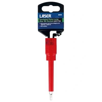 Size: T20 x 3/8"D. Overall length: 122mm. VDE certified. Manufactured to IEC60900 standards, for safe operator use on live voltages up to 1000V AC / 1500V DC. Manufactured from chrome vanadium. Suitable for use with the Laser Tools fully insulated 3/8"D ratchet (Part No. 8414) & fully insulated click type torque wrench (Part No. 8321). Additional sizes available, please see Part No. 8917 (T15), 8919 (T25), 8920 (T27), 8921 (T30) & 8922 (T40).