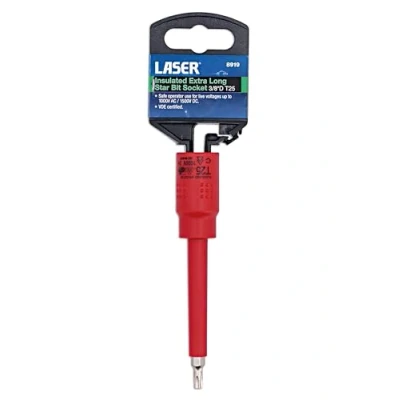 Size: T25 x 3/8"D. Overall length: 122mm. VDE certified. Manufactured to IEC60900 standards, for safe operator use on live voltages up to 1000V AC / 1500V DC. Manufactured from chrome vanadium. Suitable for use with the Laser Tools fully insulated 3/8"D ratchet (Part No. 8414) & fully insulated click type torque wrench (Part No. 8321). Additional sizes available, please see Part No. 8917 (T15), 8918 (T20), 8920 (T27), 8921 (T30) & 8922 (T40).