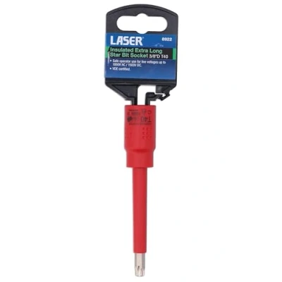 Size: T40 x 3/8"D. Overall length: 122mm. VDE certified. Manufactured to IEC60900 standards, for safe operator use on live voltages up to 1000V AC / 1500V DC. Manufactured from chrome vanadium. Suitable for use with the Laser Tools fully insulated 3/8"D ratchet (Part No. 8414) & fully insulated click type torque wrench (Part No. 8321). Additional sizes available, please see Part No. 8917 (T15), 8918 (T20), 8919 (T25), 8920 (T27) & 8921 (T30).