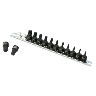 1/4"D Star* bit sockets, suitable for use on TORX fixings. Sizes: T7, T8, T9, T10, T15, T20, T25, T27, T30, T40, T45, T47, T50 x 19.5mm long. Manufactured from chrome molybdenum (SCM440), with a black phosphate finish. Supplied on a socket rail for easy storage. TORX & TORX PLUS are registered trademarks of Acument Intellectual Properties, LLC.