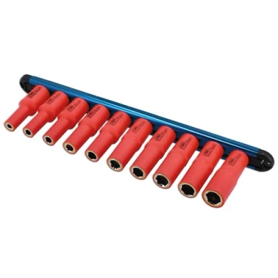 Sizes: 6, 7, 8, 9, 10, 11, 12, 13, 14, 15mm x 3/8"D. Single Hex (6pt) profile. Length: 71.8mm. VDE certified. Manufactured to IEC60900 standards, for safe operator use on live voltages up to 1000V AC / 1500V DC. Supplied on a anodised aluminium socket rail. A set of larger, 16-22mm, insulated sockets is also available, please see Part No. 8989.