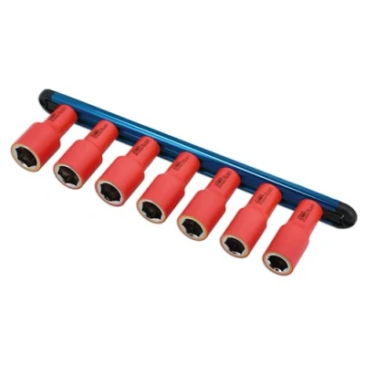 Sizes: 16, 17, 18, 19, 20, 21, 22mm x 3/8"D. Single Hex (6pt) profile. Length: 71.8mm. VDE certified. Manufactured to IEC60900 standards, for safe operator use on live voltages up to 1000V AC / 1500V DC. Supplied on a anodised aluminium socket rail. A set of smaller, 6-15mm, insulated sockets is also available, please see Part No. 8988.