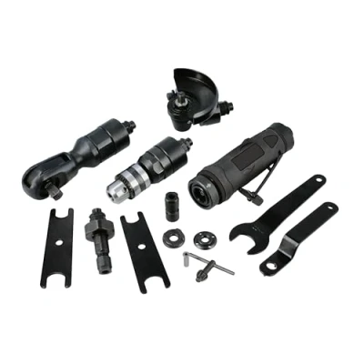 Powerful Multi headed air motor (0.5 HP). Kit includes 4 head swap spanners & air motor oil. NOTE: Oil daily. Inline die grinder (20,000 RPM) for 6mm & 3mm burrs. 3” Angle Grinder head, for use with 85mm Ø grinding discs, with a special attachment for right angle die grinder (14,000 RPM). Inline air drill attachment - 3/8” (3,600 RPM). 1/2”D air ratchet attachment (maximum 95Nm @ 160 RPM). Air inlet: 1/4" BSPT. Supplied in a plastic storage case with an EVA foam tray.