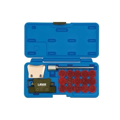 Kit includes: Self-assembly scraper with spare blade. 2.5mm hex key. Clean up tool with 15x 20mm⌀ high quality 3M sanding/cleaning discs. Simply insert the knurled handle into the separator and gently tap into joint with a hammer. Use brass blade when working on softer surfaces like aluminium oil pans. Black blade manufactured from SK5 high carbon steel, spare blade from brass. Blade width: 48mm. Supplied in a strong & durable blow mould case for storage. For scraper only please see Laser Part No. 5026. Replacement cleaning discs available separately, please see Laser Part No. 62838.