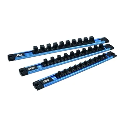 Designed for socket storage, equipped with a patented LocSoc locking mechanism. Set of 3 socket rails; 1/4"D, 3/8"D & 1/2"D socket sizes. Each rail holds 10x sockets. LocSoc mechanism - simple to use, individually tilt to lock socket holders. Manufactured from anodised aluminium, with plastic socket holders, the rail features 2x strong rare earth (NdFeB) magnets for secure holding with scratch free soft backing for surface protection. Also equipped with mounting holes for permanent attachment to non-ferrous surfaces. Also available separately, please see Laser Part Nos. 9235 (1/4"D), 9236 (3/8"D) & 9237 (1/2"D).