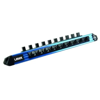 Designed for socket storage, equipped with a patented LocSoc locking mechanism. Double rail provides 2 parallel rails in 1 cleverly designed rail. Magnetic rail holds 20x 3/8"D sockets. Length: 390mm. LocSoc mechanism - simple to use, individually tilt to lock socket holders. Manufactured from anodised aluminium, with plastic socket holders, the rail features 2x strong rare earth (NdFeB) magnets for secure holding with scratch free soft backing for surface protection. Also equipped with mounting holes for permanent attachment to non-ferrous surfaces. 1/4"D & 1/2"D socket rails also available, please see Laser Part Nos. 9239 (1/4"D) & 9241 (1/2"D).