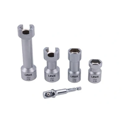 Deep sockets for Unistrut style channel fixing bolts. Sizes: 17 x 40mm long, 17 x 63.2mm long, 19 x 63.5mm & 19 x 108.5mm single hex (6pt) x 1/2"D. Also includes 1x 72mm x 1/2"D power extension with quick chuck end, to allow use of sockets in a cordless screwdriver like the Laser Part No. 8012. Manufactured from Chrome Molybdenum with a chrome plated finish. Supplied in a toolbox friendly EVA foam tray (197 x 140 x 37mm). Restricted access socket, ideal for use when working on slotted channels & metal framing systems.