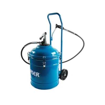 Portable hand-operated lever grease pump. No air supply required allowing for use away from the workshop. High output @ 3cc/stroke. Max. pressure: 5,000psi (350bar). 30L capacity. Internal dimensions (including lid): 345mm diameter x 370mm deep. Features a 2m long delivery hose, together with 2x heavy-duty wheels & handle for ease of transportation. Ideal for HGV, agricultural & construction use.