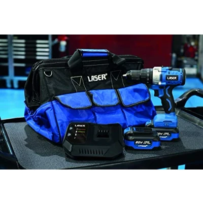 Impact drill includes variable speed control with switchable 2 speed setting, forward and reverse button and 23 torque settings for hammer action, drilling and screwdriving (max: 130Nm). No Load Speed: 500 / 1750rpm; impact rate: 9600 / 32000 BPM. High torque handle also included providing added control and accuracy when drilling high torque applications. Two 20V 4.0Ah batteries feature 10 lithium cells, diagnostic LED to read health plus built in protection against over heating and overcharging. Additional batteries available separately, please see Laser Part No. 8007. 230V 4 amp mains battery charger with BS (UK) plug features diagnostic LED plus built in protection against over heating and overcharging. Heavy duty tool bag, 18" long with reinforced, wide opening top for easy access for tools of all sizes. Organises tools for fast access with 10 external and 8 internal pockets, 2 carrying handles and one shoulder strap. Available separately, please see Laser Part No. 7846. CE, UKCA & RoHS compliant. Other tools in the family are an impact screwdriver (Part No. 8012), impact wrench 1/2"D (Part No. 8013), polisher (Part No. 8073) and angle grinder (Part No. 8010). All are available as individual products as well as part of starter kits (which include batteries, charger and storage toolbag).