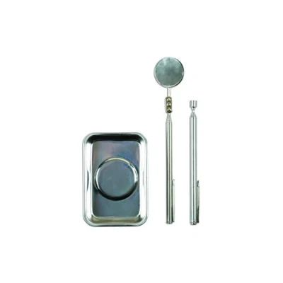 Magnetic parts tray: 64mm x 93mm Magnetic pick-up tool with a capacity of 15lbs and 630mm telescopic reach Inspection mirror with 32mm diameter mirror and 500mm telescopic reach Ideal for electricians, garages, engineering workshops and for attaching to tool boxes or vehicle ramps Pickup tool and mirror complete with pocket clips, Manufacturer: Laser Tools