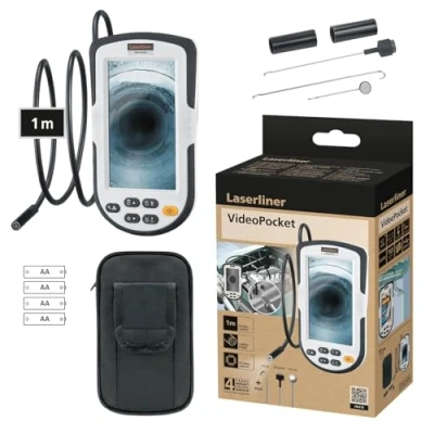 Video inspection system: Compact, sustainable video inspection system for easy inspection of hard-to-reach areas like pipes, suspended ceilings and vehicles, featuring a housing largely made from recycled plastic. Powerful illumination and clear visibility: Six high-performance LEDs with ten brightness levels ensure excellent object illumination, supported by a large, easy-to-read colour display. Precise analysis with smart functions: Digital zoom and the compare image function make it easy to identify fine details and differences between live images and saved reference images. Flexible viewing and accessories: Image rotation and mirroring ensure correct orientation, while magnet, mirror and hook attachments enable fixing, retrieval and 90° angled viewing. Easy documentation and mobile use: Images and videos can be stored in internal memory or on a micro SD card for evaluation, all in a lightweight and compact device.