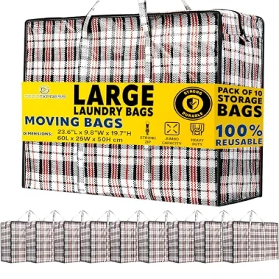 Laundry Bag Heavy Duty Storage Bags Reusable Strong Clothes Zip Nylon Large Boxes for Moving House Clothing & Wardrobe (Pack of 10)