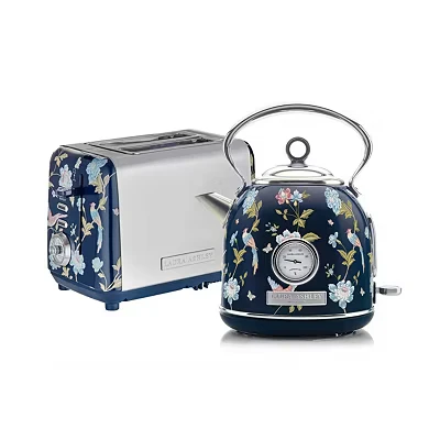 Add a vintage floral charm to your kitchen with this Elveden Navy printed toaster and kettle set from VQ. The toaster has 7 browning levels so you can make your toast just the way you like it - no more burnt edges or pale slices. And with 2 wide slots, you can toast, defrost, or reheat even thickly cut bread or crumpets. When you have friends coming over, use the 1.7 litre kettle to make up to 7 cups of tea without refilling. Plus, its 3 kW rapid boil gets your brew bubbling in no time, perfect for those hurried mornings. Good to know - The toaster's self-centering racks mean your bread will always be evenly toasted - With the removable crumb trays it's easy to keep your worktop clean and tidy - Whether you're a lefty or a righty, the kettle's 360° rotational base makes it easy to reach - If you're dealing with hard water, the kettle's anti-limescale filter will catch all those nasty bits