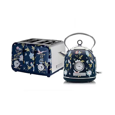Add a vintage floral charm to your kitchen with this Elveden Navy printed toaster and kettle set from VQ. The toaster has 7 browning levels so you can make your toast just the way you like it - no more burnt edges or pale slices. And with 4 wide slots, you can toast, defrost, or reheat even thickly cut bread or crumpets. When you have friends coming over, use the 1.7 litre kettle to make up to 7 cups of tea without refilling. Plus, its 3 kW rapid boil gets your brew bubbling in no time, perfect for those hurried mornings. Good to know - The toaster's self-centering racks mean your bread will always be evenly toasted - With the removable crumb trays it's easy to keep your worktop clean and tidy - Whether you're a lefty or a righty, the kettle's 360° rotational base makes it easy to reach - If you're dealing with hard water, the kettle's anti-limescale filter will catch all those nasty bits