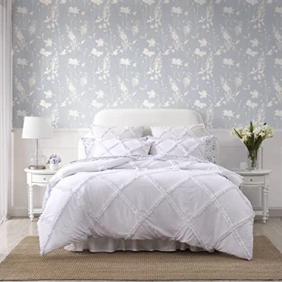 Laura Ashley Reversible Bedding Set with Matching Sham(s), Farmhouse Home Décor, Microfiber, Norah Solid White, Queen