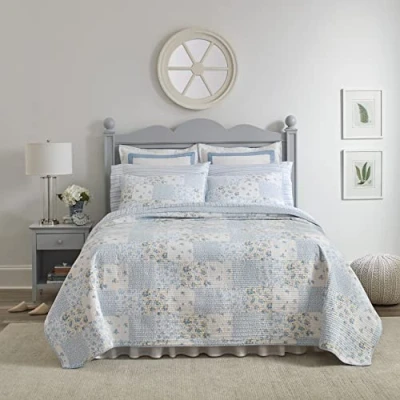 Laura Ashley Twin Quilt Set, Cotton Reversible Bedding with Matching Sham, Bedroom Decor Ideal for All Seasons (Kenna Blue, Twin)