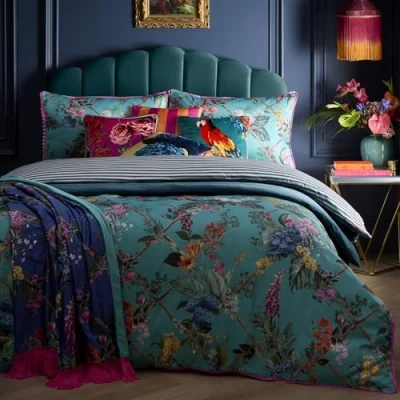 Adorned with a vibrant floral and trellis print on sumptuously soft 200 thread count cotton with a teal base, this set is a masterpiece of luxury. The reverse dazzles with white elegance, highlighted by horizontal teal pinstripes and accents of pink piping, adding a touch of regal charm to your sanctuary. A stunning home soft-furnishings collection designed by Laurence Llewelyn-Bowen, featuring his trademark style of elegance and love of a little decadence for a luxurious style. Fits a standard UK Kingsize duvet quilt size: 230cm Width x 220cm Length (97x87") - Pillowcase size 76cm x 48cm Fabric: 100% Cotton (Thread Count - 200) | Care: Wash before use at 40° , tumble dry on low. Iron whilst damp. Pack Contents: 1 x UK King Size Duvet Cover and matching 2 x Pillowcases