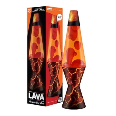 The Original Lava Lamp - iconic shape and global brand since 1965 Easy to operate: plug it in, allow the wax to heat up, and enjoy the mesmerizing flow Red wax/orange liquid/printed, wrapped base and cap Includes glass globe, aluminum base and cap, G9 appliance bulb, plug to fit a standard wall outlet 14.5" tall; 20oz