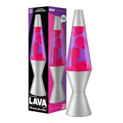 Item Size: 14.5 inches tall LAVA Lamp produces a soft warm light and mesmerizing visuals of ever changing, moving wax gently rising and falling in iconic trademarked-shaped glass globe 2121 is a classic LAVA Lamp with pink wax in purple liquid and silver aluminium base and cap Illuminate your mood with styles for any room and personality 25 Watt light bulb included; Plugs into UK power outlet