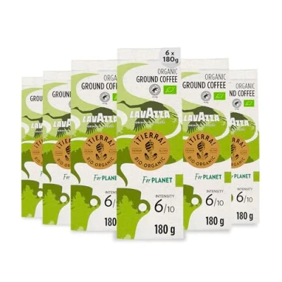 Lavazza, Tierra for Planet, Ground Coffee, 6 Packs of 180g, Ideal Moka Pot or Filtered with Fruity and Flowery Notes, a Mild Taste, 100% Organic Arabica, Intensity 6/10, Light Roast