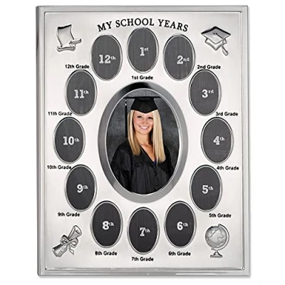Traditional silver metal frame that will compliment any décor Constructed of heavy weight metal and silver-plated; includes high quality black velvet backing There are 13 openings, 12 smaller openings for grades 1 through 12 Wipe clean with dry cloth Holds multiple photos; overall dimensions 9.0 inches by 11.0 by 0.7 inches