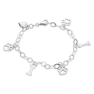 Layering Best Friend Animal Pet Lover Dog Puppy Link Multi Charm Dangling Heart, Bone & Paw Print Bracelet For Women Teen .925 Sterling Silver 7 Inch