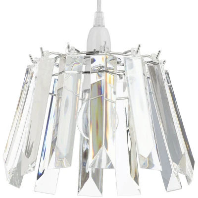 General description Add a unique touch to your home today with the Layka ceiling light pendant shade. The individual crystal effect chisel bars create a stunning cascade of light across a space, complemented by a chrome finish on the base, making it a glamorous feature perfect for a bedroom, dining room, or living room as a high-end accent. An easy-to-fit design allows for simple attachment to an existing fitting for ease of use. Technical specifications Product Type: Easy Fit Shade Bulbs Required: 1 (Not Included) Bulb Type: Simply attaches to existing fitting Max Bulb Wattage: 60 Watt Height: 16.5 cm approx. Diameter: 25 cm approx. Material: Metal, Acrylic Colour: Clear