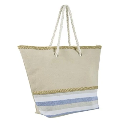Canvas feel beach bag with zip closure & blanket stitched trim Horizontal blue and natural stripes at the bottom Cotton rope handles Fully lined interior with zip pocket for your phone & cash Measures 55 x 40 x 15cm approx.