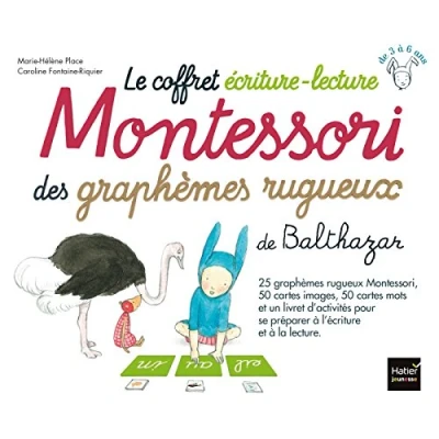 Le coffret écriture lecture Montessori des graphèmes rugueux de Balthazar: Contient : 25 rugueux, 50 cartes images, mots et un livret d'activités