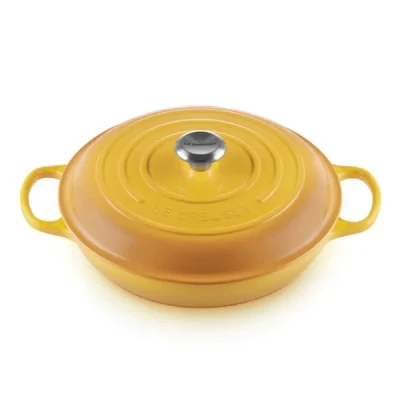 Amazon MarketplaceShallow enamelled cast iron dish, Tight-fitting lid, Fuss-free one-pot cooking, Serves 4-6 people, Made in France Easy food release interior enamel, For quick simmering or slow cooking on medium-low heat, Heats evenly with lasting heat retention Versatile Use: From meat or veg casseroles and one-pot roasts, pasta, to curry, soup and even bread and cakes Easy to use and clean: Withstands any temperature, Suitable for ovens, grills and all hob types (incl. induction), Easy-grip handles, Easy-handwash enamel, Dishwasher safe Contents: 1x Signature cast iron shallow casserole, 30 cm, Round, Dimensions with handles: 40.2 x 31.7 x 13.5 cm, Weight: 5.55 kg, Colour: Nectar, 21180306724430