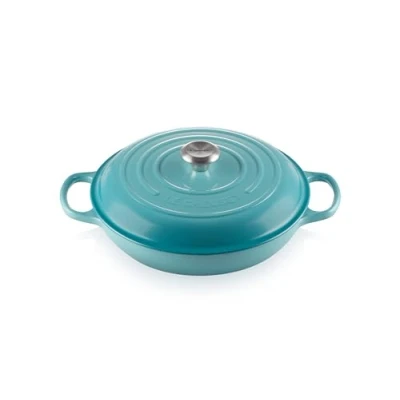 Shallow enamelled cast iron dish, Tight-fitting lid, Fuss-free one-pot cooking, Serves 4-6 people, Made in France Easy food release interior enamel, For quick simmering or slow cooking on medium-low heat, Heats evenly with lasting heat retention Versatile use: From meat or veg casseroles and one-pot roasts, pasta, to curry, soup and even bread and cakes Easy to use and clean: Withstands any temperature, Suitable for ovens, grills and all hob types (incl. induction), Easy-grip handles, Easy-handwash enamel, Dishwasher safe Contents: 1x Le Creuset Signature Cast Iron Shallow Casserole, 1x Care & Use Booklet, Dimensions: 40.2x31.7x13.5cm, Weight: 5.56kg, Capacity: 3.2L, Colour: Teal, 21180301702430