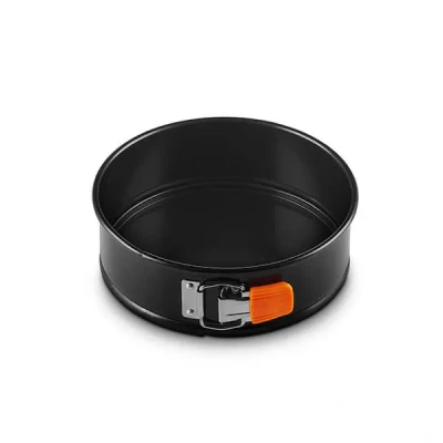 AmazonLe Creuset Non-stick Bakeware Springform Round Cake Tin with clever-side clip ; removable base, Lifetime Guarantee Versatile: Oven safe to 240°C/Gas Mark 9, Ideal for baking delicate sponge cakes, rich tortes; soft cheesecakes , Heats evenly without warping Strong heavy-gauge carbon steel, Anti-warp, metal, Utensil safe with care Easy to use and clean: Non-stick coating, Easy food release, Rolled edge, Secure-hold silicone inserts for added grip, Easy handwash Contents: 1x Toughened Non-Stick Bakeware Springform Round Cake Tin, 1x Care; Use Booklet, Material: Carbon Steel, Dimensions: 21.7 x 21.7 x 7cm, Weight: 0.46kg, Colour: Black, 46091200010000