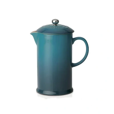 This Le Creuset Stoneware Deep Teal Cafetiere, designed to let you enjoy coffee in colour! Coarsely ground coffee beans are steeped in boiling water, and then filtered by plunging the mesh sieve through the press.Direct contact between the beans and the water means a stronger flavour. Loose tea leaves can also be used in a cafetiere. 1L capacity.Made from specialist clays and fired at the highest temperatures, all Le Creuset stoneware is strong and durable, so much so that a 10-year guarantee is supplied with each piece.The dense stoneware provides exceptional thermal resistance and maintains even temperature. Thanks to Le Creuset's enamelling expertise, their stoneware is also easy to clean and scratch resistant.Vibrant and moody, the NEW Deep Teal collection from Le Creuset combines the calming properties of blue with the renewal qualities of green, making it a revitalising and rejuvenating shade that will add atmosphere and sophistication to any kitchen.