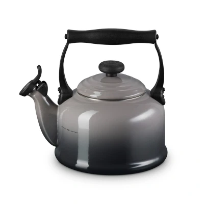 Crafted from enamelled steel, the Le Creuset Flint Traditional Kettle will add a touch of classic styling to your kitchen. Thanks to the extra-strong induction suitable bottom, your water heats up fast, while the ergonomic, heat-resistant handle provides safe and easy pouring. And when the water boils, the kettle will give a pleasing whistle.Le Creuset Traditional Kettle dimensions: L27.6cm x W21cm x H25cm. Weight: 1.63kg. Capacity: 2.1L.This Le Creuset Flint Traditional Kettle is supplied with a 5 year Le Creuset guarantee.
