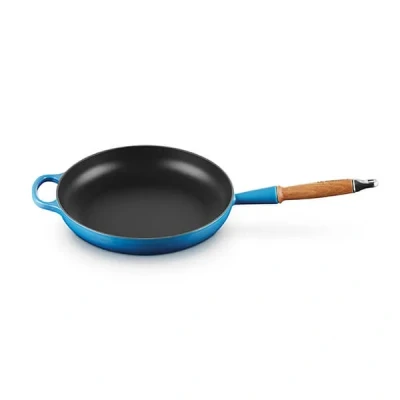 The Le Creuset Signature Azure Cast Iron 28cm Frying Pan is ideal for everyday cooking tasks like browning and searing. Made from cast iron with a durable easy clean black enamel coating distributes heat evenly and seals the flavour, nutrients and moisture into food quickly.Suitable for all hob types including induction, the signature frying pan includes an integrated helper handle alongside the re-designed stay cool wooden handle with an integral hanging hook.Dimensions: L56.3cm x W28.9cm x H8.4cm. Weight: 4.59kg.The Le Creuset Azure Cast Iron 28cm Frying Pan is made in France and is supplied with a Le Creuset lifetime guarantee.