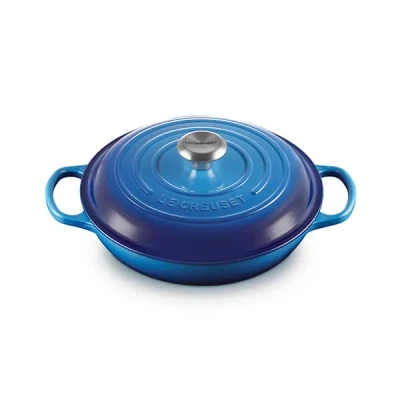 Amazon MarketplaceShallow enamelled cast iron dish, Tight-fitting lid, Fuss-free one-pot cooking, Serves 2-4 people, Made in France Easy food release interior enamel, For quick simmering or slow cooking on medium-low heat, Heats evenly with lasting heat retention Versatile use: From meat or veg casseroles and one-pot roasts, pasta, to curry, soup and even bread and cakes Easy to use and clean: Withstands any temperature, Suitable for ovens, grills and all hob types (incl. induction), Easy-grip handles, Easy-handwash enamel, Dishwasher safe Contents: 1x Le Creuset Signature Cast Iron Shallow Casserole, 1x Care & Use Booklet, Dimensions: 35.2x27.8x11.9cm, Weight: 4.21kg, Capacity: 2L, Colour: Azure, 21180262202430