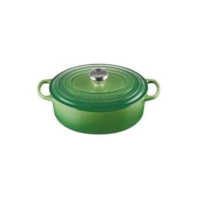 With a 4.1 litre capacity, this Le Creuset Signature Bamboo Cast Iron 27cm Oval Casserole is the ideal size when cooking for 4-6 people. Just as versatile as Le Creuset’s round casseroles, this oval version cuts down on the space taken up in the oven. It can also be used on all types of hob, including induction, or under a grill.The cast iron construction is excellent at retaining heat, resulting in even cooking and browning. It will also keep cooked food warmer for longer when serving at the table. The tight fitting lid also helps the cooking process by locking in moisture and enhancing flavour.The light enamel interior makes cleaning easier whilst the large handles are easy to grip when lifting the casserole, even when wearing oven gloves. The heat resistant knob (oven safe up to 260°C) also provides a better grip when wearing oven gloves or mitts.Handcrafted at the Le Creuset foundry in northern France since 1925, Le Creuset casseroles are made from premium quality cast iron ensuring each product is beautifully finished and long lasting. A true kitchen essential, the cast iron oval casserole is not only perfect for making casseroles, stews and one pot roasts, but is versatile enough for baking cakes and bread. Le Creuset cast iron cookware also works efficiently at low to medium cooking temperatures and retains heat effectively, ensuring food stays warm for longer.Le Creuset cast iron casseroles are suitable for all hob types (including ceramic, halogen, induction, gas and oil or wood). They are also dishwasher safe although we would recommend hand washing.The Le Creuset 27cm oval cast iron casserole is ideal for 4-6 people and has a capacity of 4.1L. Dimensions: L35.2cm x W22.6cm x H15.4cm. Weight: 4.43kg.The Le Creuset Signature Bamboo Cast Iron 27cm Oval Casserole is supplied with a lifetime manufacturer's guarantee.