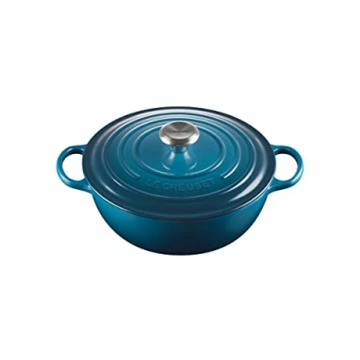 Cast iron soup pot, Tight-fitting lid, Simple one-pot cooking, Eye-catching and vibrant exterior enamel, Made in France Easy-release toughened interior enamel, Durable cast iron for even heat and lasting heat retention, Curved sides ensure dynamic and even cooking Prepare a variety of delicious one-pot recipes, Designed for stews and soups, Ideal for low and slow simmering to lock in flavours, Lifetime guarantee Easy to use and clean: Withstands oven temperatures up to 250°C, Suitable for ovens, grills and all hob types (incl. induction), Easy-grip handles, Easy-handwash enamel, Dishwasher safe Contents: 1x Le Creuset Signature Cast Iron Soup Pot with Lid, Material: Enamelled Cast Iron, Dimensions: 34.8 x 27.5 x 16.1 cm, Weight: 4.255 kg, Colour: Deep Teal, 21114266420430