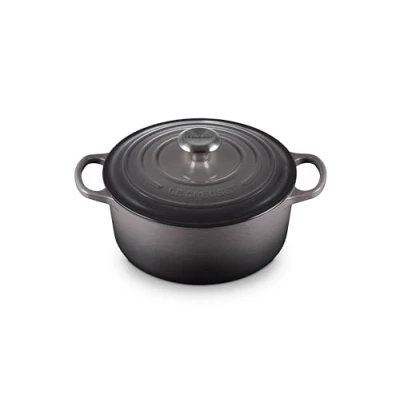 The iconic Le Creuset Signature Flint Cast Iron 24cm Round Casserole is perfectly designed for stews, casseroles, roasts, soups and baking. Make mouth-watering and memorable meals that are full of intense flavour in this one-stop pot.Advanced sand interior enamel - durable, easy to clean and specifically engineered to resist staining with a higher resistance to wear and tear. Significantly improves durability and performance, being 35-40% more resistant to thermal shock and 16% more resistant mechanical shock (chipping from utensils). It is also more resistant to acid attack and 24% more resistant to enamel erosion. There is less absorption of food colours and it is more durable against repeated dishwasher use as well as being 45% easier to clean.Large handles are easier to grip and lift when full, even when wearing oven gloves or mitts.Stylish and durable brushed stainless steel finish. Easy, comfortable and natural grip, suitable for all temperatures.Tight fitting lid with built in stabilisers for enhanced moisture lock in and flavour, during cooking.Handcrafted at the Le Creuset foundry in northern France since 1925, Le Creuset casseroles are made from premium quality cast iron ensuring each product is beautifully finished and long lasting. Le Creuset cast iron cookware also works efficiently at low to medium cooking temperatures and retains heat effectively, ensuring food stays warm for longer.Le Creuset cast iron casseroles are suitable for all hob types (including ceramic, halogen, induction, gas and oil or wood) and are also oven and grill safe.Dishwasher safe, although hand washing is recommended.The Le Creuset 24cm round cast iron casserole is ideal for 4-5 people and has a capacity of 4.5L. Dimensions: L32.5cm x W25.2cm x H16.6cm. Weight: 4.31kg.This Le Creuset Signature Flint Cast Iron 24cm Round Casserole is supplied with a manufacturer's lifetime guarantee.