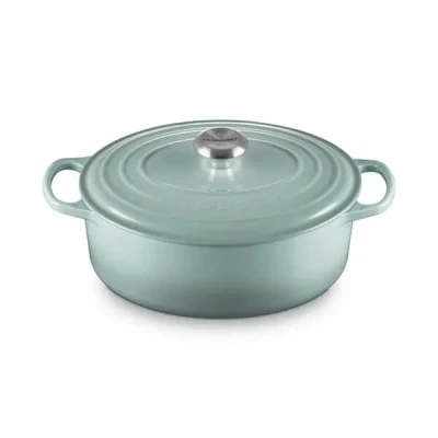 With a 4.7 litre capacity, this Le Creuset Signature Sea Salt Cast Iron 29cm Oval Casserole is the ideal size when cooking for 6 people. Just as versatile as Le Creuset’s round casseroles, this oval version cuts down on the space taken up in the oven. It can also be used on all types of hob, including induction, or under a grill.The cast iron construction is excellent at retaining heat, resulting in even cooking and browning. It will also keep cooked food warmer for longer when serving at the table. The tight-fitting lid also helps the cooking process by locking in moisture and enhancing flavour.The light enamel interior makes cleaning easier whilst the large handles are easy to grip when lifting the casserole, even when wearing oven gloves. The heat-resistant knob (oven safe up to 260°C) also provides a better grip when wearing oven gloves or mitts.Handcrafted at the Le Creuset foundry in northern France since 1925, Le Creuset casseroles are made from premium quality cast iron ensuring each product is beautifully finished and long-lasting. A true kitchen essential, the cast iron oval casserole is not only perfect for making casseroles, stews and one-pot roasts but is versatile enough for baking cakes and bread. Le Creuset cast iron cookware also works efficiently at low to medium cooking temperatures and retains heat effectively, ensuring food stays warm for longer.Le Creuset cast iron casseroles are suitable for all hob types (including ceramic, halogen, induction, gas and oil or wood). They are also dishwasher safe although we recommend hand washing.The Le Creuset 29cm oval cast iron casserole is ideal for 6 people and has a capacity of 4.7L. Dimensions: L37cm x W23.7cm x H16.7cm. Weight: 4.68kg.The Le Creuset Signature Sea Salt Cast Iron 29cm Oval Casserole is supplied with a lifetime manufacturer's guarantee.