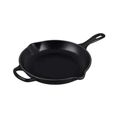 AmazonEnamelled cast iron skillet frying pan with helper handle and pouring lips, Made in France Easy to use and clean: Suitable for ovens, grills, BBQs and all hob types (incl. induction), Easy-clean enamel, Dishwasher safe Versatile use: Heats evenly with lasting heat retention, For frying, searing, slow cooking or baking on medium heat Helper handle for even weight, Cast iron handle with hook for hanging, Heat protection handle glove sold separately Contents: 1x Le Creuset Cast Iron Skillet Frying Pan, 1x Care and Use Booklet, External Dimensions: 40.7x26.9x5cm, Diameter: 23cm, Weight: 1.93kg, Colour: Matte Black, 20182230000422