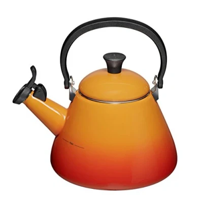AmazonEnamelled steel kettle with heat-resistant, phenolic handle and whistle, serves up to three cups Suitable for all hob types, including induction, ceramic, electric, gas and AGA cookers Elegant design, wide base for efficient heating, steady pouring thanks to upright, handle position, 5-year guarantee Safe and easy to use and clean thanks to locked, ergonomic handle, handwash recommended Contents: 1x Le Creuset Kone Stovetop Kettle with Whistle, Material: Enamelled Steel, Dimensions: 25.6 x 19.9 x 24.3 cm, Weight: 1.14 kg, Colour: Volcanic, 92000200090000