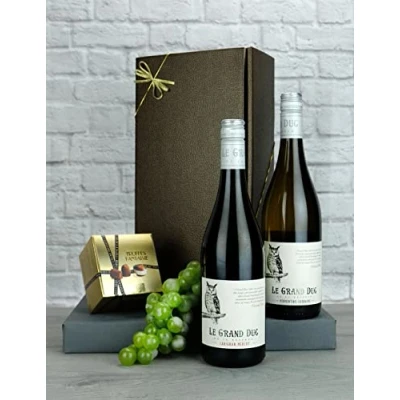 2x 750ml Bottles (1 RED, 1 WHITE) Chocolates: 100g Marc de Champagne Chocolate Truffles Featuring a Reserve Carignan/Merlot red wine and a Reserve Rolle/Grenache white wine, the Le Grand Duc Wine twin pack also includes a 100g box of Champagne truffles. Packaged in an elegant leather effect gift box If you are wanting to send this item as a gift remember to check the box on the cart before checkout.