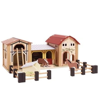 GET BACK TO NATURE WITH THIS FUN WOODEN FARM SET: This wooden toy farm playset includes a large barn with hay loft, a milking parlour, a stable, and a pigsty. Mounted on a detailed decorated baseboard and complete with movable fences. (Scaled to Budkins animals & characters & compatible with standard plastic animals - Animals and characters sold separately). GREAT FOR INTERACTIVE PLAY: Kids love playing together with this fun, colourful scenario and role play wooden toy farm set Encourages your child to learn turn taking skills as well as social and language development. CHILDREN LOVE THIS FUN ADVENTURE WOODEN LEARNING TOY: Designed in-house, this interactive, wooden range encourages children to use their imaginations to recreate farm-yard fun. Each item has been beautifully illustrated to create a realistic and engaging experience. EXTEND PLAY TIME WITH THE FARMS & ANIMALS COLLECTION: Wooden Educational Farms & Animals Collection The Wooden Farmyard Toy Playset makes an excellent accompaniment to other wooden toys within Le Toy Van's Farms And Animals Collection - Including Le Barnyard, Red Barn, Bertie's Wooden Tractor, Sunny Farm Wooden Farm Animals Animal Toys and the Farmers Gift Pack. SAFE TOY: Decorated with non-toxic paints and tested to the highest safety standards. Using natural materials, including replenishable legal quality smooth rubber-wood and an array of techniques from hand screen printing to water staining, these detailed hand-finished toys are unique and loved by little hands., Manufacturer: Le Toy Van